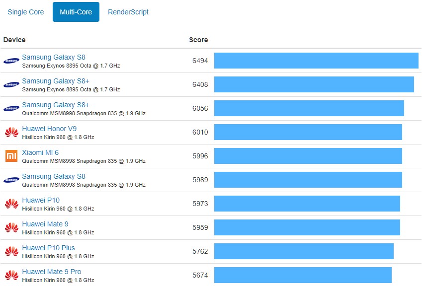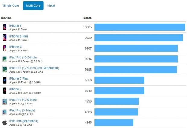 Chỉ trong lần test đầu tiên, Apple A11 đã chiếm ngay vị trí đầu bảng vào bỏ xa các thiết bị Android mạnh mẽ nhất. Như bạn thấy ở hình dưới, điểm đơn nhân của iPhone 8/8 Plus và iPhone X cao hơn gấp đôi so với tất cả các máy Android và hơn 50% ở bài kiểm tra đa nhân.