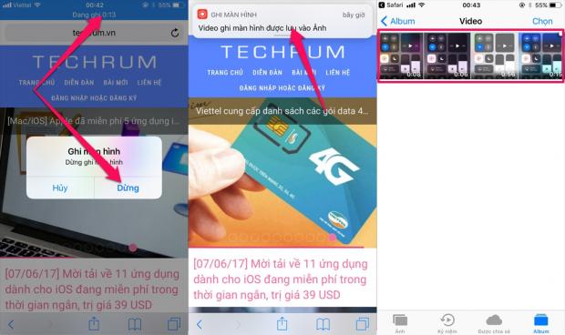 Bước 6: Để tắt hoặc hoàn tất quá trình ghi hình, bạn chạm vào phần màu xanh ở cạnh trên màn hình cảm ứng > nhấn nút Dừng là xong. Đoạn video sẽ tự động lưu vào Camera roll trên thiết bị.
