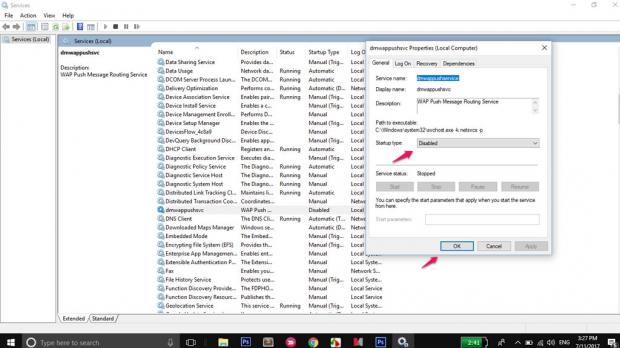dmwappushsvc, sau đó chọn Disabled như hình dưới: