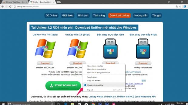 Để giúp cho người dùng dễ dàng kiểm tra link tải file có virus hay không, VirusTotal đã cung cấp các exception giúp tích hợp VirusTotal vào trình duyệt web. Bạn chỉ cần click phải lên đường dẫn và chọn Scan with VirusTotal.