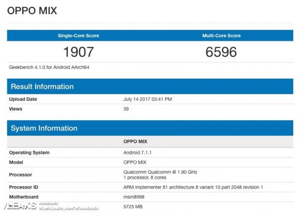 Mới đây, thiết bị của OPPO cũng vừa bị phát hiện trên hệ thống dữ liệu của Geekbench. Theo đó, model này sẽ có tên mà là 'MIX' với vi xử lý Snapdragon 835, 6GB RAM và hệ điều hành Android 7.1.1.