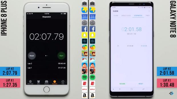 Ở vòng thử nghiệm đầu tiên, với vi xử lý A11 Bionic mạnh mẽ, iPhone 8 Plus đã load ứng dụng nhanh hơn chiếc Galaxy Note 8. Tuy nhiên, thời gian chênh lệch không quá đáng kể, chỉ vào khoảng 3 giây.