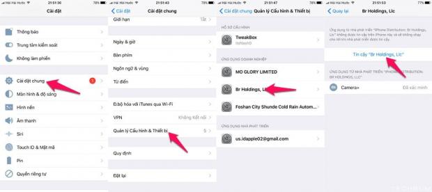 Sau khi ứng dụng đã tải về máy, tại giao diện màn hình chính mở 'Cài đặt' > Cài đặt chung > chọn 'Quản lý cấu hình' và nhấn tin cậy nhà phát triển.