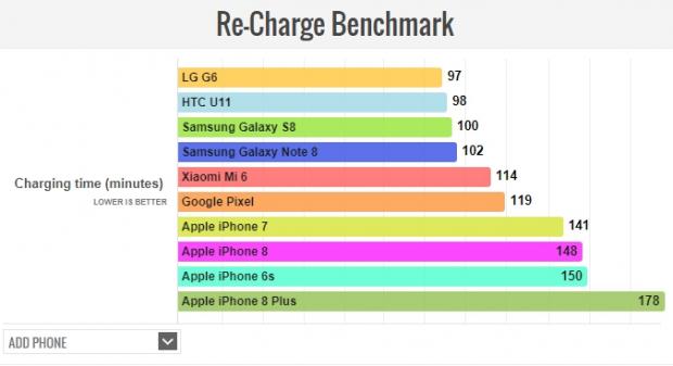 Tuy nhiên vì không được trang bị cục sạc nhanh trong hộp khi bán ra nên iPhone 8 Plus đã bị các đối thủ Android khác vượt qua trong bài thử nghiệm sạc pin. Theo Apple, thiết bị sẽ có được 50% dung lượng pin chỉ trong vòng 30 phút với bộ sạc nhanh được bán riêng của hãng. Tuy nhiên, bạn đọc cũng có thể mua các bộ sạc nhanh của bên thứ ba để có được mức giá tốt hơn.