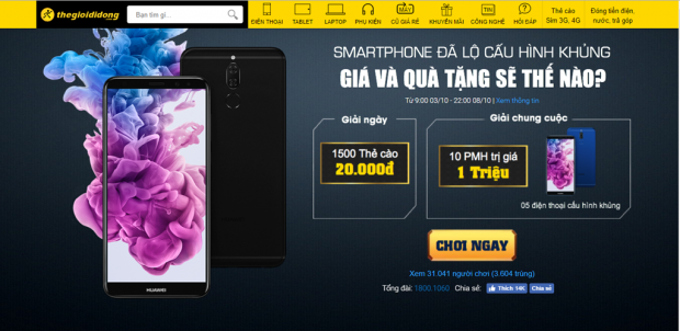 Người dùng chỉ cần đăng nhập và trả lời câu hỏi trắc nghiệm dự đoán của mình về smartphone Huawei cấu hình khủng và mở hộp quà may mắn trúng thưởng. Phần thưởng cho giải ngày là 1500 thẻ cào 20.000 đồng. Phần thưởng cho giải chung cuộc là 10 phiếu mua hàng 1 triệu đồng/phiếu và đặc biệt là 5 chiếc smartphone cấu hình khủng sẽ được trao cho người chiến thắng.