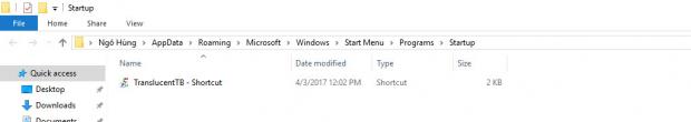Bước 4: Tiếp theo, mở hộp thoại Run bằng cách nhấn tổ hợp phím Windows + R, nhập shell:startup sau đó nhấn Enter. Cửa sổ Startup hiện ra, copy file TranslucentTB.exe - Shortcut ra desktop là xong.