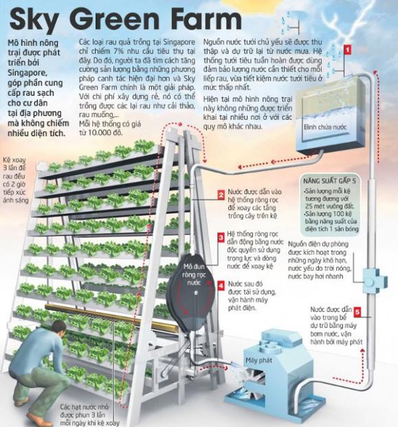 Thống kê trước đây cho thấy các loại rau quả trồng tại Singapore chỉ chiếm 7% nhu cầu tiêu thụ tại đây. Do đó, người ta đã tìm cách tăng cường sản lượng bằng những phương pháp canh tác hiện đại hơn và Sky Green Farm chính là một giải pháp. Với chi phí xây dựng không quá đắt, chỉ khoảng 10.000 đô la mỗi kệ với sản lượng bằng 25 mét vuông đất trồng trọt, Sky Green Farm có thể trồng được các lại rau quả nhiệt đới như cải thảo, rau muống và một số loại rau khác mà cư dân tại đây thích dùng.