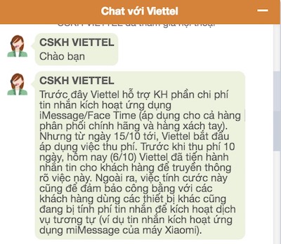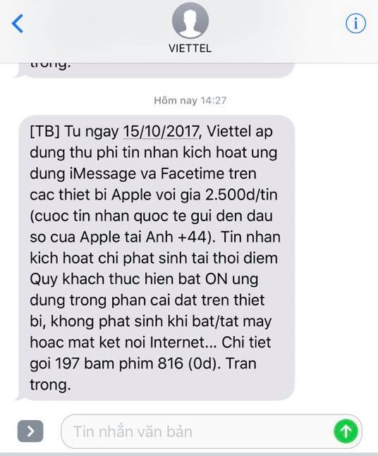Vào khoảng chiều nay (06/10) rất nhiều người dùng nhà mạng Viettel đã nhận được thông báo tính phí kích hoạt dịch vụ iMessage và FaceTime, không ít khách hàng tỏ ra hoang mang vì trước đây sử dụng Viettel có thể kích hoạt hai dịch vụ trên hoàn toàn miễn phí mà nay lại phải trả tiền, phía Viettel đã có trả lời cho thắc mắc này.