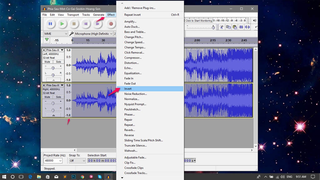 Bước 4: Click chọn vào track 2, sau đó click Effect chọn Invert.