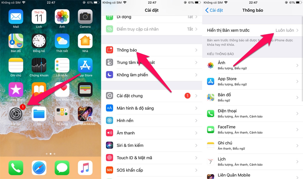 Mở Cài đặt > chọn mục Thông báo > Hiển thị Bản Xem trước
