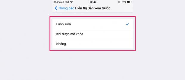 Sau khi nâng cấp lên phiên bản iOS 11, bạn sẽ có thêm một tính năng riêng biệt khi thiết lập cài đặt thông báo là Hiển thị Bản xem trước. Đi kèm hai tùy chọn luôn luôn hiển thị, khi được mở khóa hoặc không thiển thị bất kỳ thông báo nào trên màn hình khóa.
