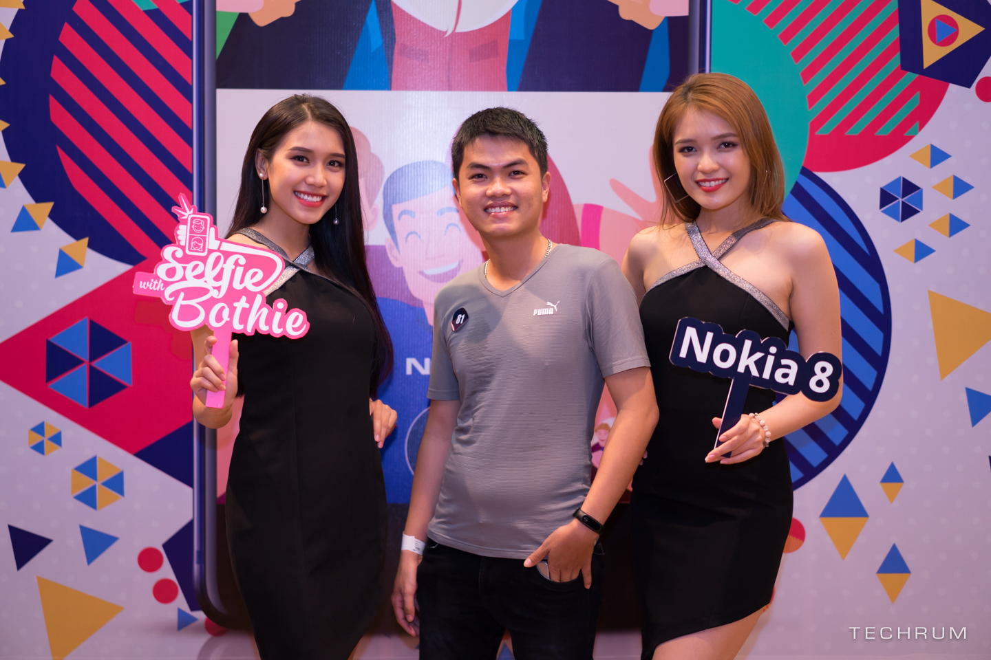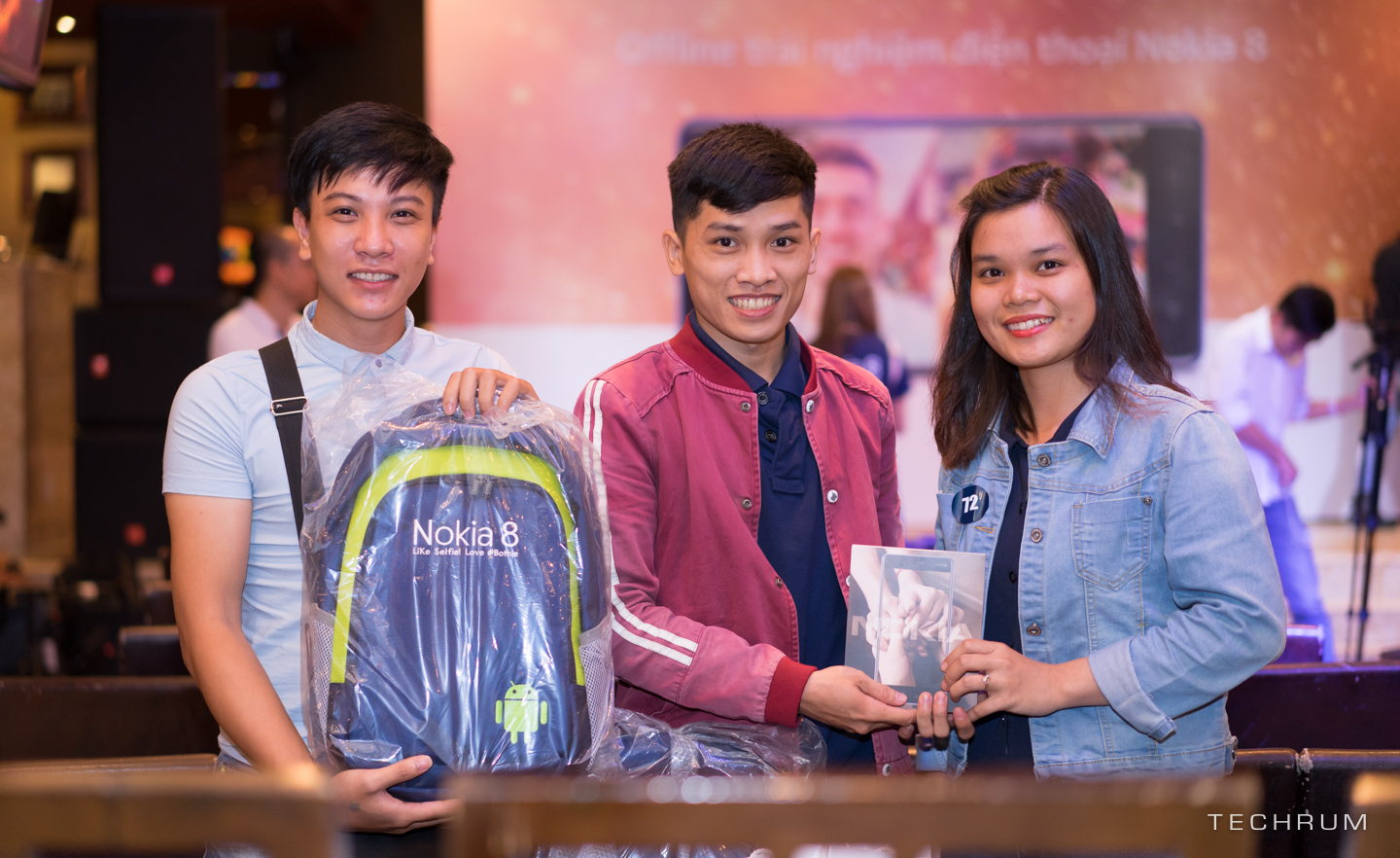 Hai bạn từ phải qua là những người may mắn nhất của buổi offlien khi liên tục nhận được những phần quà giá trị đặc biệt là mẫu điện thoại Nokia 8. Còn anh bạn bên trái chỉ vào đứng ké cho đủ đội hình.