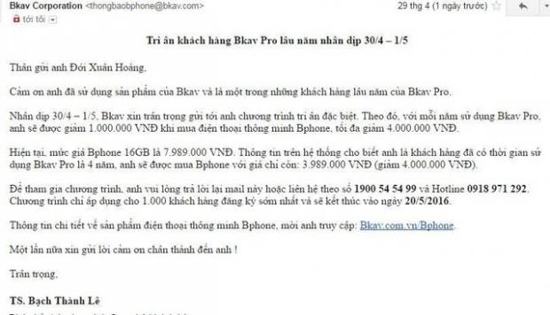 Theo đó, một email được BKAV gửi tới người dùng với nội dung mỗi năm sử dụng BKAV bản quyền, bạn sẽ được giảm ngay 1.000.000 đồng khi mua siêu phẩm Bphone, được giảm tối đa là 4.000.000 đồng. Nói cách khác, với mức giảm giá tối đa, Bphone phiên bản 16 GB chính hãng chỉ có giá từ 3,9 triệu đồng.