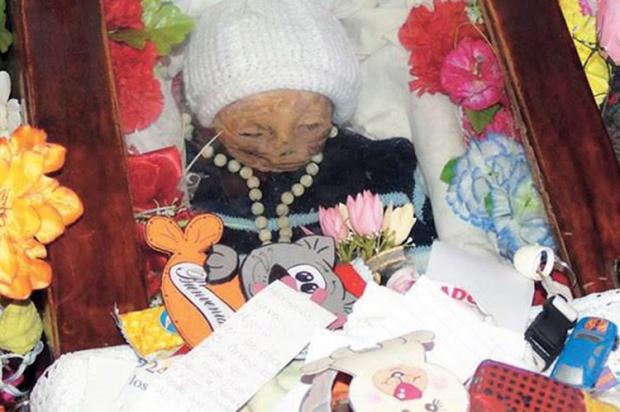 Xác ướp bé Gaitan bên cạnh hoa và đồ chơi của những người đến viếng. (Ảnh: CEN).