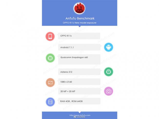 Mới đây thông số cấu hình chính thức của OPPO R11s cũng đã bị rò rỉ trên hệ thống cơ sở dữ liệu của AnTuTu benchmark. Theo đó, thiết bị sẽ sở hữu màn hình có độ phân giải 2160 x 1080 với tỷ lệ 18:9, vi xử lý Snapdragon 660, GPU Adreno 512, 4GB RAM và 64GB bộ nhớ trong.