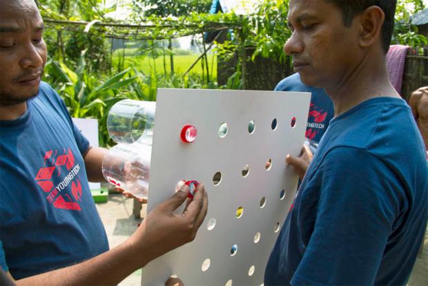 Tình nguyện viên đang 'lắp đặt' điều hòa không cần điện năng cho các hộ dân Bangladesh. (Ảnh: Internet).