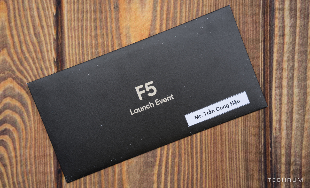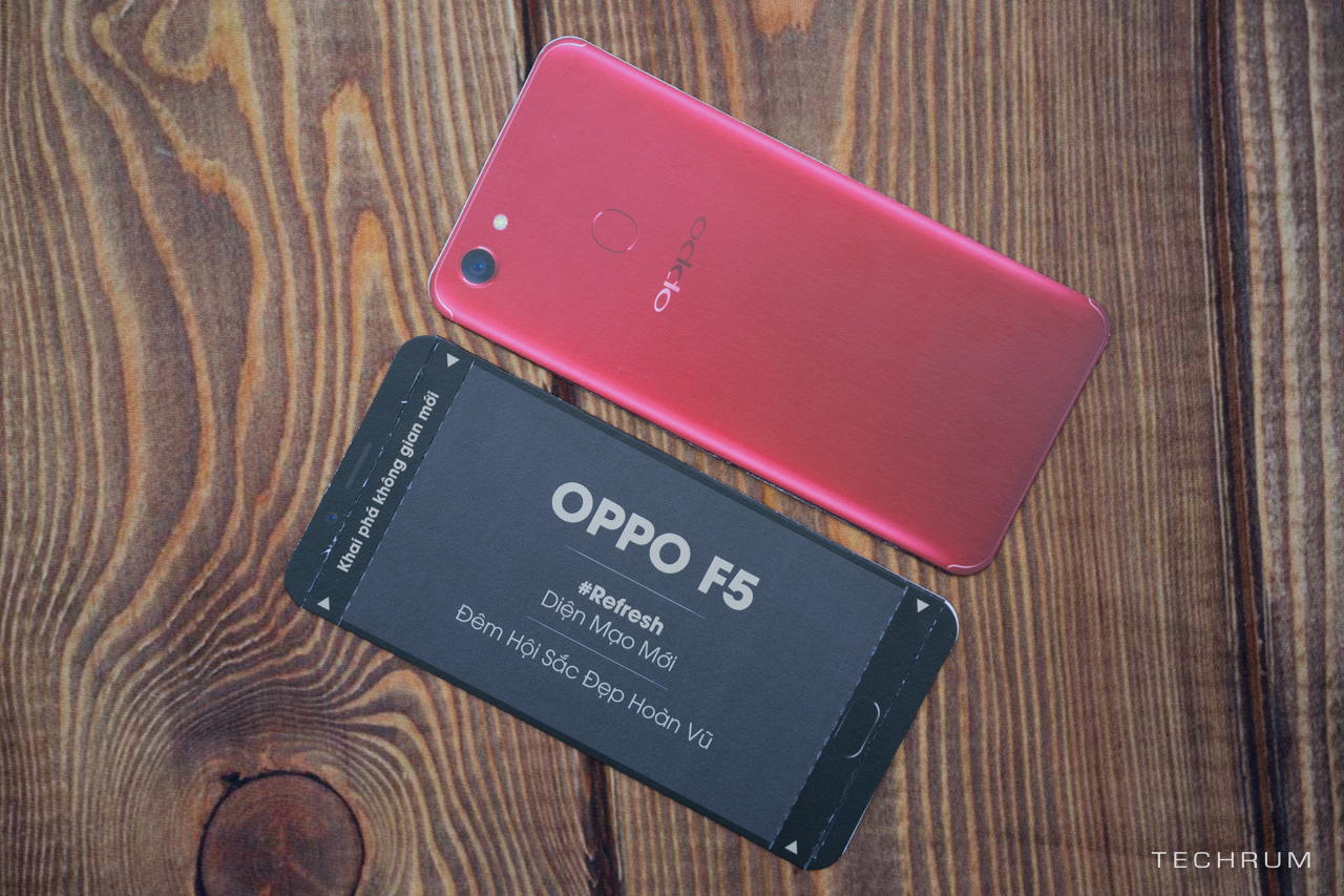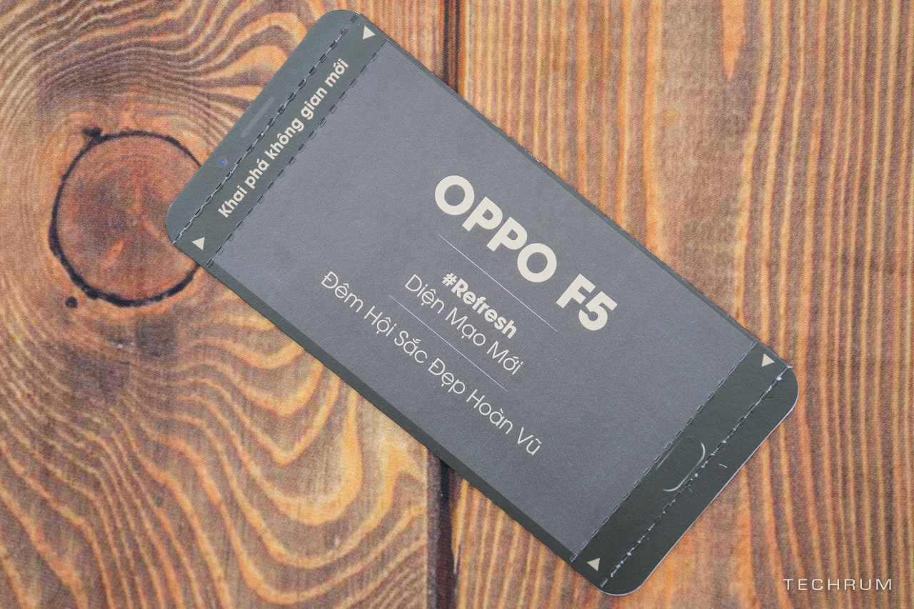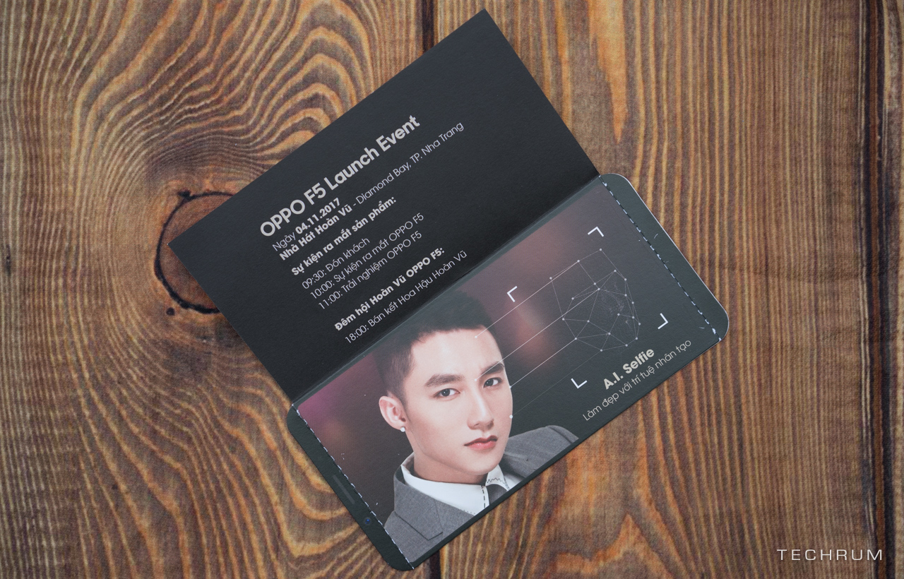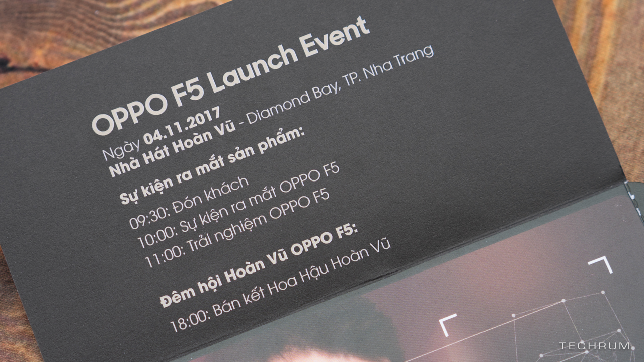OPPO là một trong rất ít nhà sản xuất điện thoại có mặt tại Việt Nam đầu tư kĩ cho tấm thiệp mời ra mắt các sản phẩm chiến lược của hãng. Mặt sau của tấm thiệp được thiết kế dựa trên ngoại hình thật của OPPO F5 và phối màu khá tốt tạo cho người cầm có cảm giác như thấy cả những được nét cong ở hai cạnh máy, còn mặt trước sẽ ghi tên thiết bị cũng như chủ đề của buổi giới thiệu sản phẩm là 'Đêm Hội Sắc Đẹp Hoàn Vũ'.