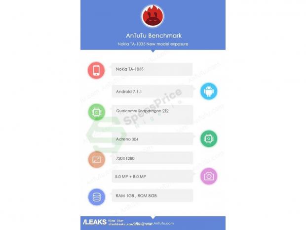 Đầu tiên, Nokia 2 sẽ có tên mã là TA-1035, tên mã này từng bị rò rỉ vài ngày trước đây thông qua nhà phân phối B&H cùng mức giá chỉ 99USD. Cung cấp sức mạnh cho thiết bị sẽ là vi xử lý Snapdragon 212 đến từ Qualcomm với xung nhịp 1.3GHz, GPU Adreno 304, 1GB RAM, 8GB bộ nhớ trong cùng khả năng mở rộng qua khe cắm thẻ nhớ microSD.