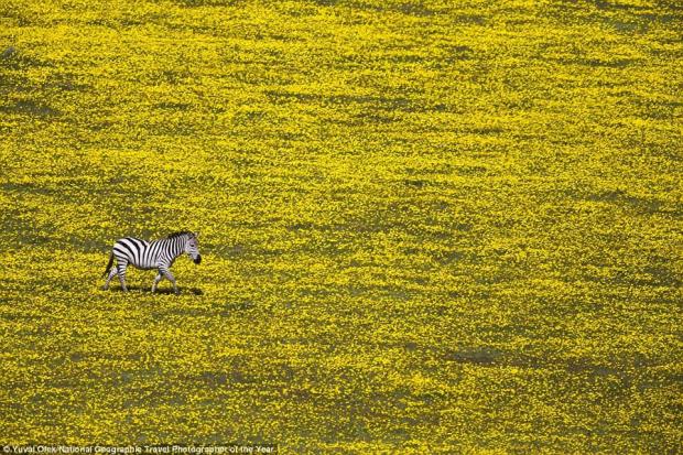 Một con ngựa vằn lang thang giữa cánh đồng hoa vàng gần công viên quốc gia Serengeti, Tanzania.