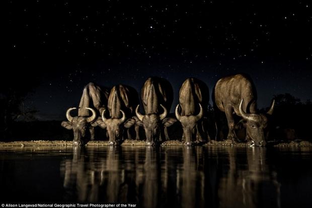Dưới bầu trời đêm đầy sao ở Nam Phi, đàn trâu tiến gần mép nước để thỏa mãn cơn khát.