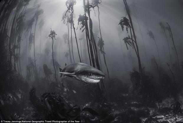 Con cá mập 7 mang đang bơi giữa rừng tảo ngoài khơi Simonstown, gần Cape Town, Nam Phi.