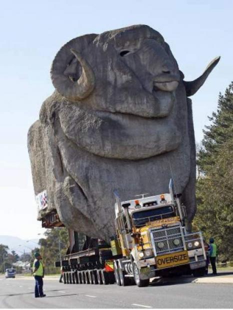 Một chiếc xe tải chở một bức tượng đá khổng lồ