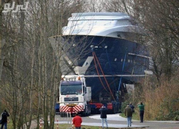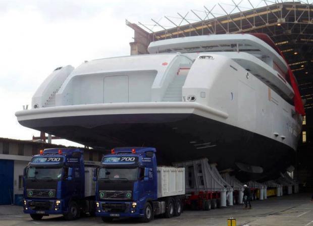 Chiếc tàu chuẩn bị ra biển với sự giúp đỡ của hai chiếc xe tải.