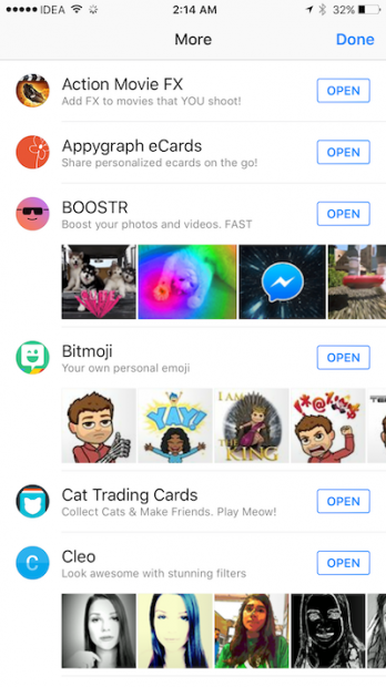 Nếu bạn để ý, phía bên phải thanh công cụ có một nút 3 chấm, nơi đây chứa tùy chọn gửi nhiều thứ thú vị như ảnh GIF, video hay các ứng dụng liên quan tương thích với Messenger. bạn có thể tải những app này về và sử dụng, chúng được tích hợp liền mạch với Messenger.