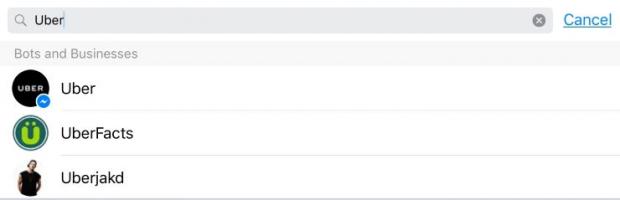 Tìm các con bot bằng cách search trong mesenger như tìm bạn bè, tuy nhiên các con bot sẽ có dấu sét nền xanh dương ở avatar như hình sau:
