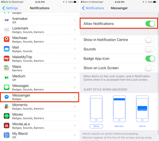 Đôi lúc, bạn muốn được nghỉ ngơi, và không bị làm phiền bởi những thông báo ting ting từ Messenger, hãy làm theo vài bước sau đây để tắt hoàn toàn thông báo của ứng dụng đi nhé. Đầu tiên, bạn vào Settings > Application > Notifications và tìm đến 'Messenger', sau đó tắt thông báo tại mục 'Allow Notifications'.