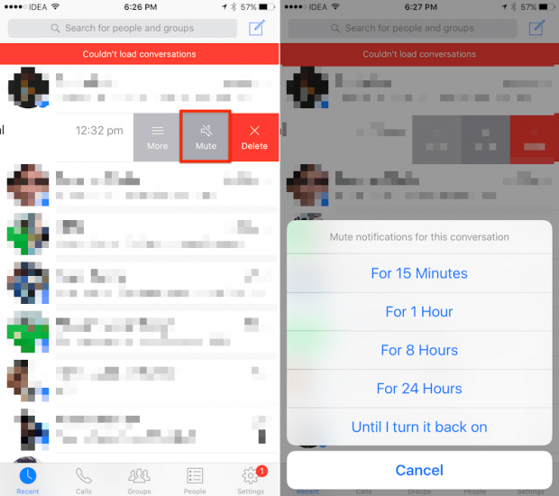 Tuy nhiên, nếu bạn không muốn tắt tất cả các cuộc trò chuyện, mà chỉ muốn tắt thông báo từ một hoặc một số cuộc hội thoại nhất định? Bạn cần vào ứng dụng Messenger, trong danh sách hiện lên, bạn tìm đến cuộc trò chuyện muốn tắt thông báo và trượt nó sang trái, chọn 'Mute' và chọn thời gian tắt. Có các tùy chọn tắt trong 15 phút, 1 tiếng, 8 tiếng,.. hay cho tới khi nào bạn bật thông báo trở lại.