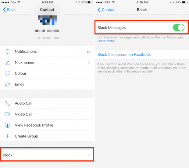 Đôi khi bạn không thích một người nào đó, hay bị làm phiền bởi những tin nhắn của họ. Bạn có thể chặn những tin nhắn từ người này bằng cách mở cuộc hồi thoại, sau đó bấm vào tên người đó ở đầu trang, và chọn 'Block'. Bạn cũng có tùy chọn chỉ chặn tin nhắn người đó, hoặc chặn hẳn người đó trên Facebook.