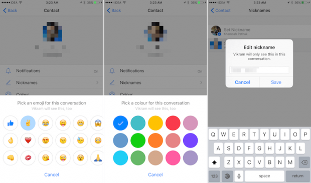 Đôi lúc bạn muốn phân biệt các cuộc hội thoại với nhau? Hay muốn gửi một biểu tượng khác ngoài nút Like?... hãy cùng thử những trải nghiệm mới mẻ này bằng cách nhấn vào phần tên của cuộc trò chuyện, và tùy chọn Colors, Emoji hay Nickname để thay đổi màu sắc, đổi biểu tượng và thay đổi biệt danh cho những người trong cuộc thoại.