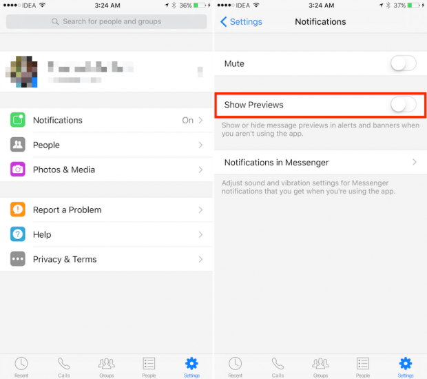 Mặc định, Messenger sẽ hiển thị tin nhắn trên thanh thông báo, nếu bạn không muốn người khác có thể đọc được những tin nhắn này, hãy vào Setting > Notifications và tắt tùy chọn 'Show Previews'.