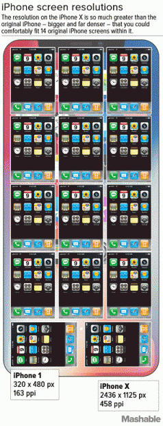 Trải qua một thập niên đầy sóng gió, cuối cùng màn hình 'Super Retina' của iPhone X đã xuất hiện với nhiều ưu điểm vượt trội. Nó sở hữu rất nhiều điểm ảnh và thừa sức ghép đủ 14 màn hình của iPhone bản gốc.