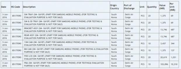 Mặc dù Galaxy On7 mới được Samsung bán ra tại Việt Nam nhưng có vẻ như hãng điện thoại Hàn Quốc đang bắt đầu khởi động cho qua trình thử nghiệm phiên bản mới của điện thoại này. Theo đó, ngày 03/06 trên trang web theo dõi xuất nhập khẩu của Ấn Độ – Zauba xuất hiện một cái tên nằm trong danh sách nhập khẩu của Samsung đó là Samsung SM-G610F.
