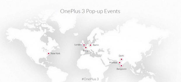 Được biết sự kiện giới thiệu sản phẩm mới của hãng là OnePlus 3 sẽ tổ chức tại 7 thành phố lớn trên thế giới bao gồm: New York, London, Paris, Berlin, New Delhi, Mumbai và Bangalore. Trong khi ngày và địa điểm chi tiết tại Mỹ và các thành phố ở châu Âu đã được công bố, thì những thành phố tại châu Á hiện vẫn chưa có thông tin chi tiết.