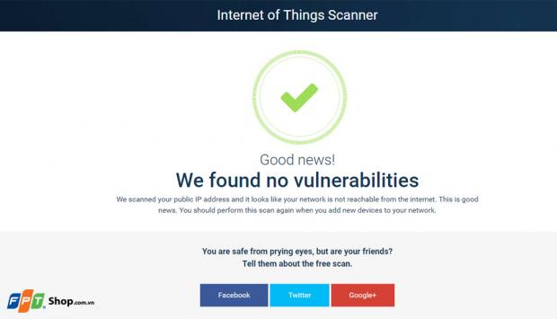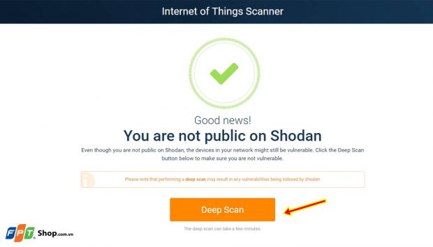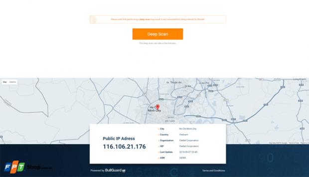 Đầu tiên, người dùng truy cập tại đây: http://iotscanner.bullguard.com/, kế đến nhấn vào nút Check If i am an Shodan để kiểm tra. Nếu xuất hiện dấu chẹc màu xanh lá, tức thiết bị mà người dùng đang sử dụng để truy cập mạng là an toàn. Và ngược lại, nếu xuất hiện dấu check màu đỏ tức thiết bị đó đang bị nguy hiểm và người dùng có thể làm theo các hướng dẫn của trang web đề xuất để khắc phục. Người dùng có thể chon nút Deep Scan nếu muốn quét chi tiết hơn, tất nhiên thời gian sẽ lâu hơn.
