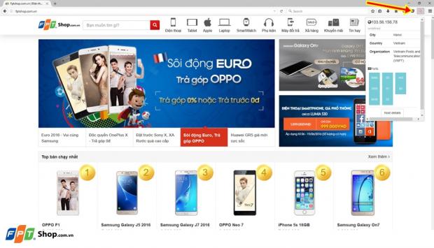 Sau khi tải và cài đặt xong, một biểu tượng nhỏ của Shodan sẽ xuất hiện ở góc phải, người dùng chỉ cần truy cập vào 1 trang web bất kỳ, sau đó nhấn vào biểu tượng đó để xem các thông tin như: địa chỉ IP, thành phố, khu vực, nhà mạng cung cấp,..... hoặc nhấn vào nút Host Details để biết thêm nhiều thông tin khác sâu hơn như: Port, server,......