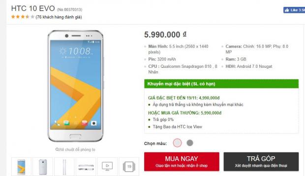 Cụ thể, từ ngày 17-19/11, HTC 10 EVO sẽ được hạ từ 5.99 triệu đồng xuống còn 4.99 triệu, giảm 1 triệu đồng. Lưu ý là số lượng có hạn, vì vậy bạn cần nhanh tay lên nhé.