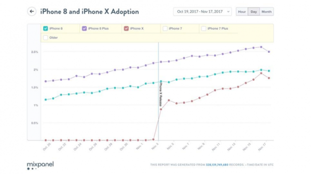 Một dữ liệu khác được thu thập bởi Mixpanel cho thấy tỷ lệ người dùng iPhone X đã nhanh chóng bắt kịp iPhone 8 chỉ sau 2 tuần lên kệ, doanh số lần lượt là 1.75% và 1.95% trên tổng số iPhone đang được sử dụng. Nhưng iPhone X vẫn thua iPhone 8 Plus với 2.49%, điều này cho thấy iPhone 8 Plus vẫn là sản phẩm được nhiều người chọn mua cho dù nó có thiết kế không quá đột phá.