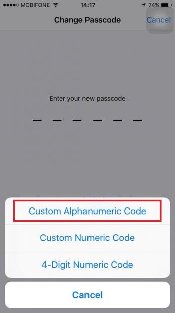 Bước 5: Bạn nhấn vào mục Custom Alphanumeric Code để đặt mật khẩu mới gồm nhiều ký tự hoặc Custom Numeric Code nếu chỉ đặt mật khẩu số.