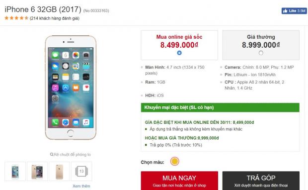 Cách đây một thời gian, iPhone 6 32GB 2017 từng được giảm giá chính hãng xuống ngưỡng 8.999.000 VNĐ. Mới đây, máy còn tiếp tục được giảm thêm 500 ngàn nữa và giờ đây bạn chỉ cần bỏ ra số tiền 8.499.000 VNĐ là hoàn toàn có thể trở thành chủ nhân của một chiếc iPhone 6 32GB chính hãng tuyệt vời.