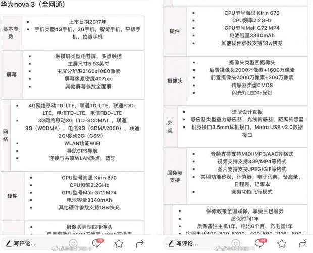 Cụ thể, theo thông tin mới được chia sẻ từ trang Androidheadlines thì mới đây, một danh sách các thông số kỹ thuật của Huawei Nova 3 vừa được tung lên mạng xã hội Weibo, Trung Quốc. Theo đó, Nova 3 sẽ có màn hình kích thước 5.93 inch, độ phân giải Full-HD+ (2,160x1,080 pixel), tỉ lệ 18:9 và có viền màn hình siêu mỏng. Bên trong, máy sử dụng vi xử lý “cây nhà lá vườn” Kirin 670, 8 nhân xung nhịp tối đa 2.2 GHz, đi kèm là GPU Mali G72 MP4 và viên pin có dung lượng 3,340 mAh.
