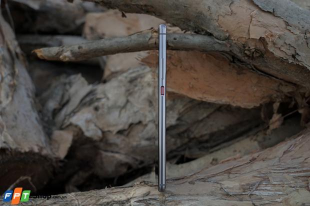 Cạnh phải có khe căm sim, microSD. Ở góc này dễ thấy cạnh viền máy được hơi bo tròn một chút như iPhone.
