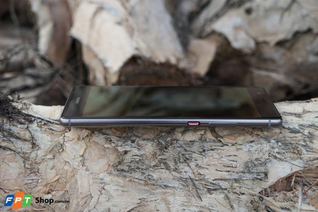 Cạnh trái có phím nguồn có khắc họa tiết với viền đỏ và phím tăng giảm âm lượng.
