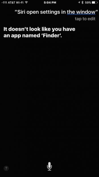 Giờ đây nếu bạn yêu cầu Siri 'open settings in the window' (mở thiết lập trong cửa sổ) thì cô ta sẽ phản hồi là mình không tìm thấy ứng dụng tên Finder.