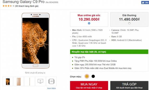 Cụ thể, hiện trên hệ thống bán lẻ , chiếc Galaxy C9 Pro đang được giảm giá từ 11.49 triệu xuống chỉ còn 10.29 triệu đồng, giảm tới 1.2 triệu đồng khi mua online.