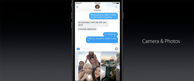 Chúng ta có thể dễ dàng nhận thấy là giao diện Camera & Photos khi ta bấm vào icon máy ảnh trong iMessage đã trở nên trực quan hơn. Bạn có thể gửi ảnh, chụp ảnh và xem trước nội dung ngay lập tức mà không cần phải truy cập vào thư mục Photos như hiện nay.