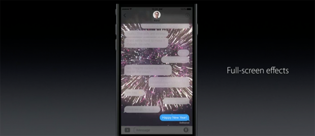 Nếu đã quá chán với giao diện background nhàm chán trên hệ điều hành iOS 9, bạn có thể cập nhật lên iOS 10 để trải nghiệm tính năng mới này trên ứng dụng iMessage. Theo đó, ứng dụng iMessage trên iOS 10 được tích hợp sẵn một số hiệu ứng nền, ví dụ như bắn pháo hoa, nổ pháo để thay thế. Về sau thì tùy chọn này sẽ đa dạng hơn nhờ việc cung cấp hiệu ứng từ các lập trình viên bên thứ ba.